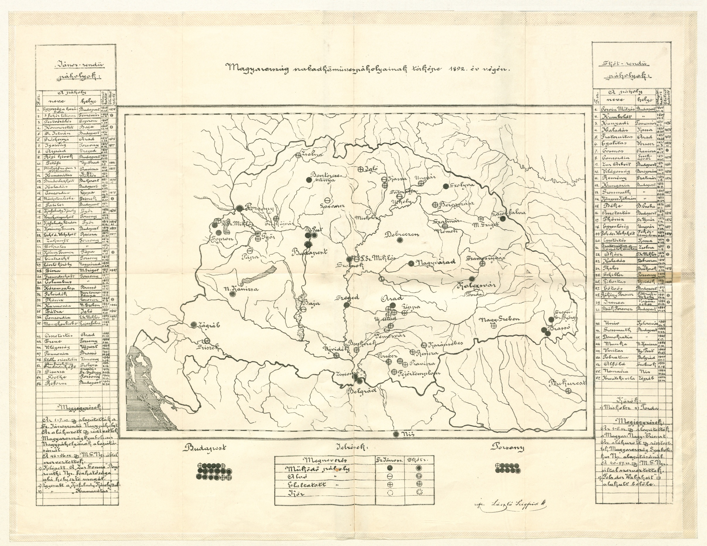 Magyarország szabadkőműves páholyainak térképe, 1892